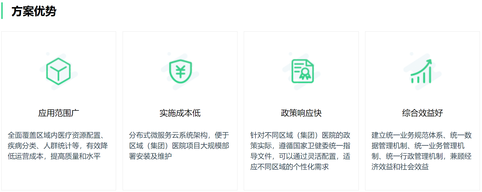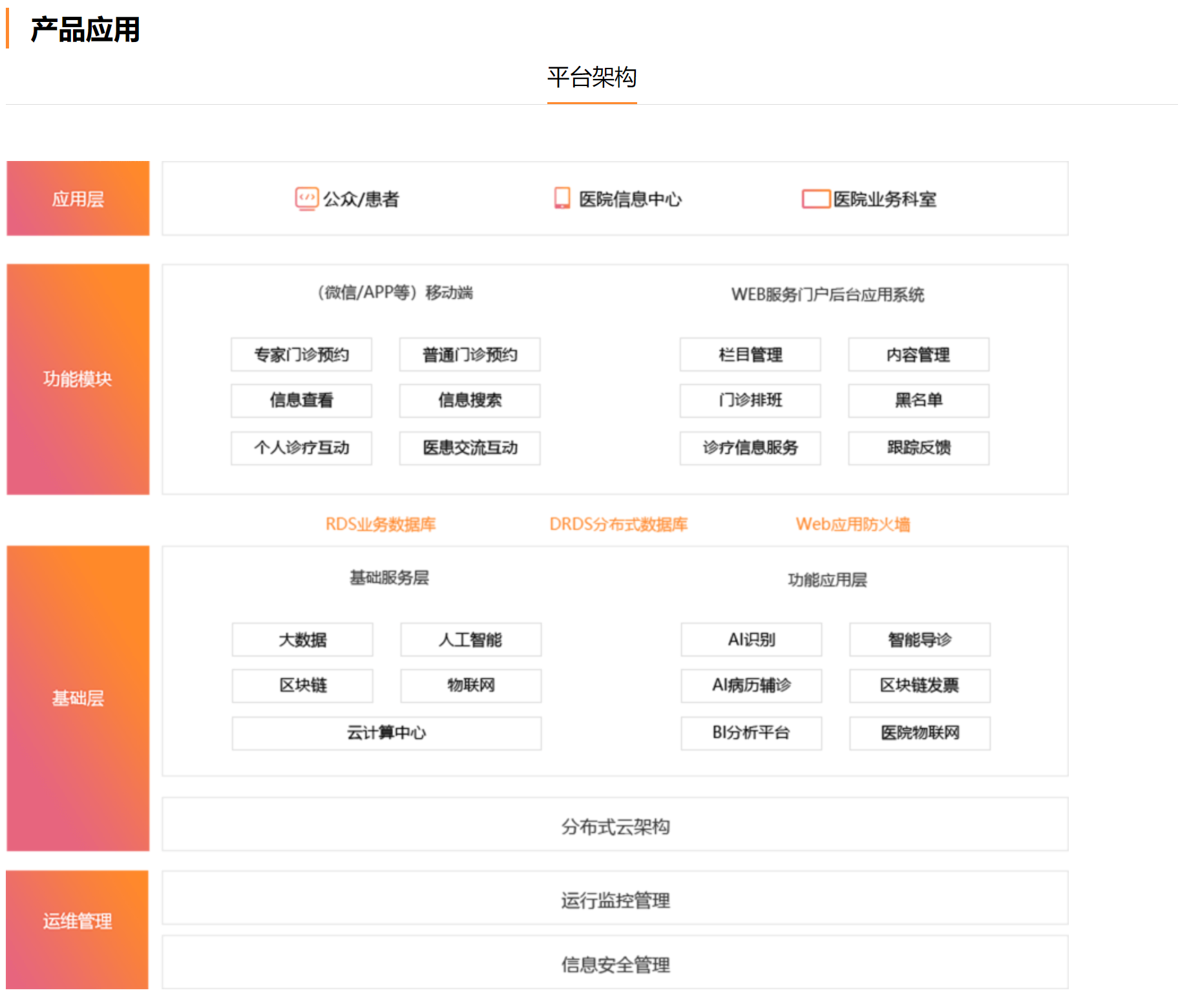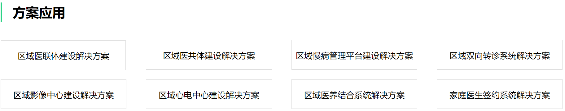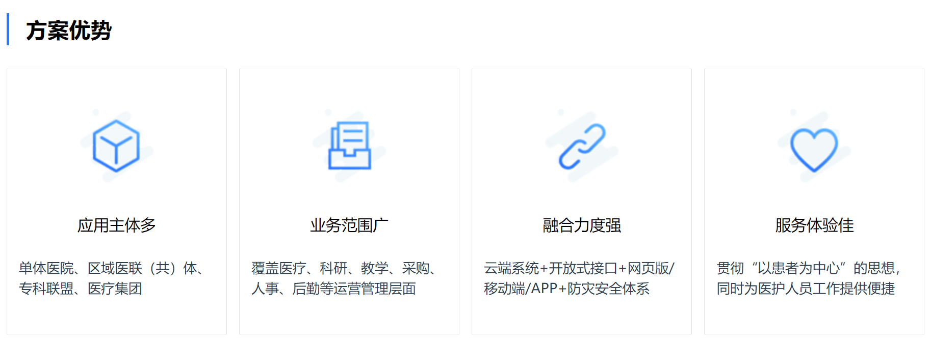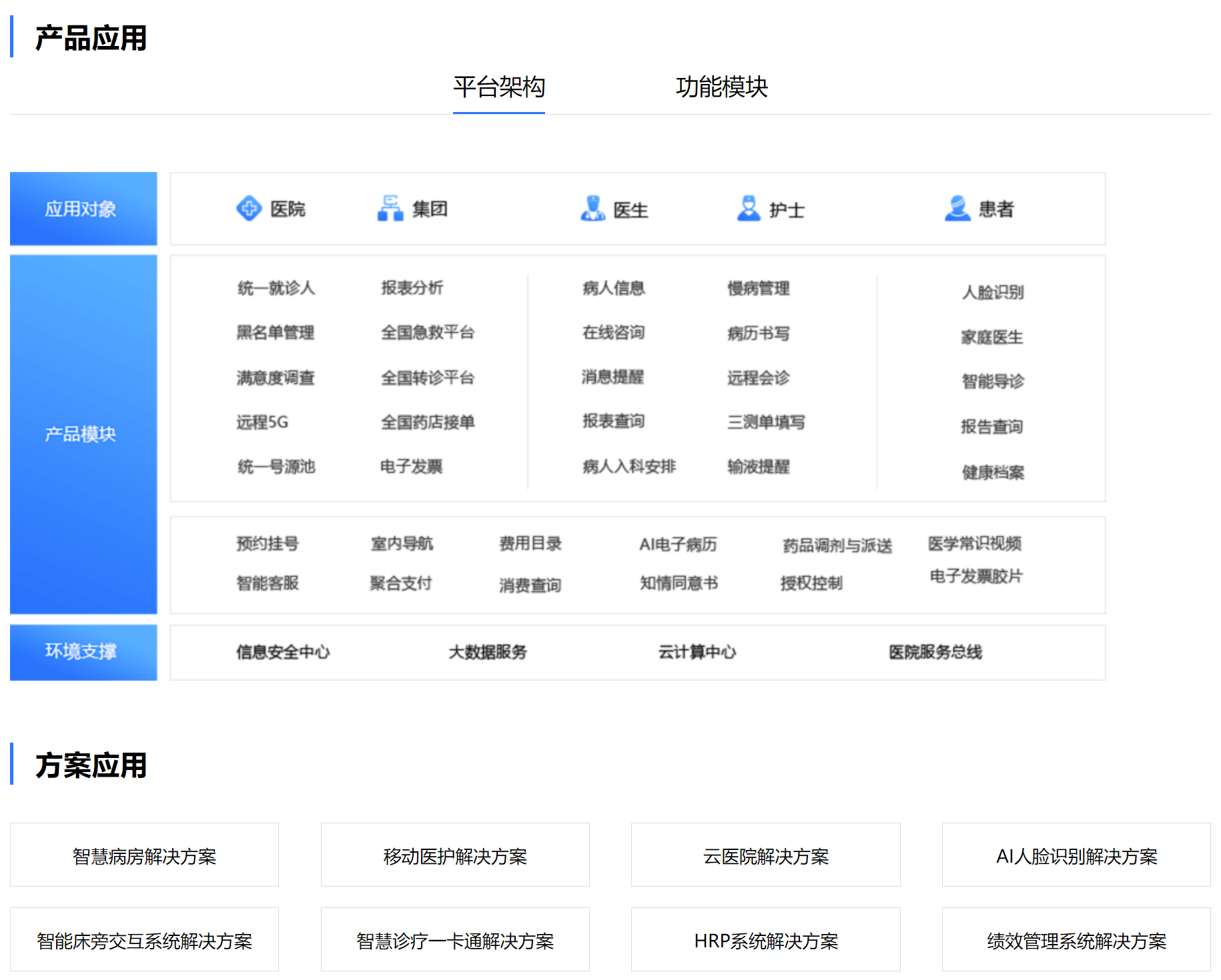 我们的业务产品体系,覆盖医疗信息化生态产品(智慧医院、互联网医疗、区域医联体/医共体平台、医疗大数据),并围绕该体系解决方案,进行不断的打磨,深入研发。