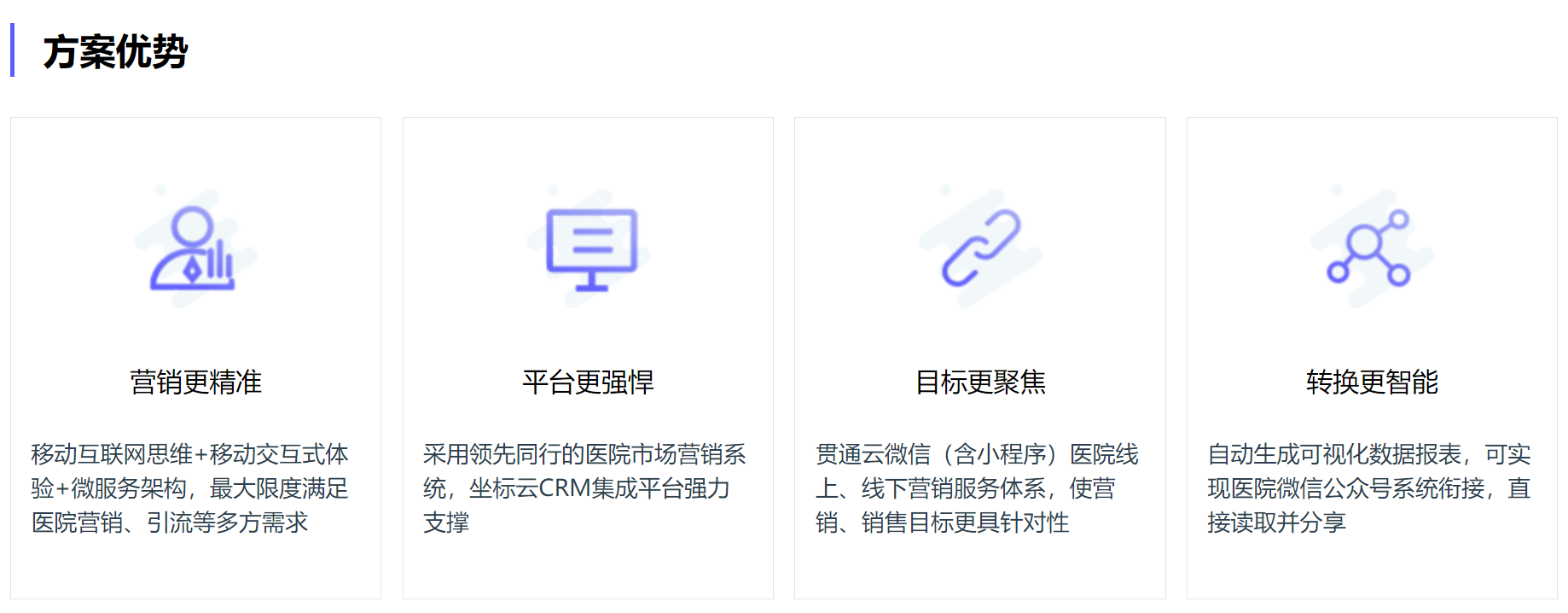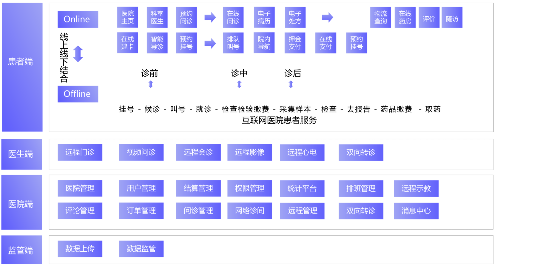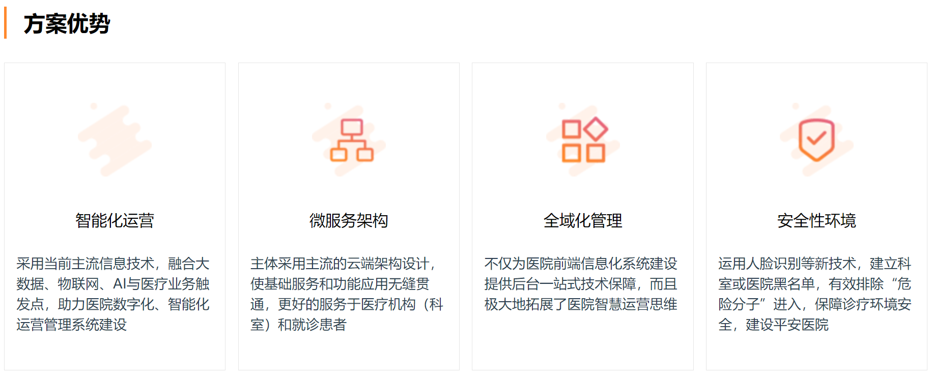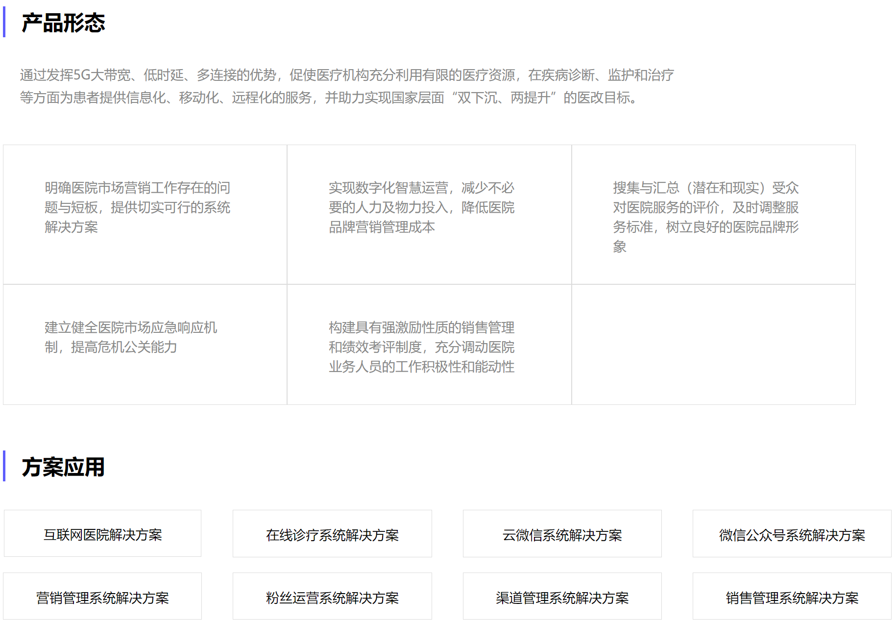 我们的业务产品体系,覆盖医疗信息化生态产品(智慧医院、互联网医疗、区域医联体/医共体平台、医疗大数据),并围绕该体系解决方案,进行不断的打磨,深入研发。